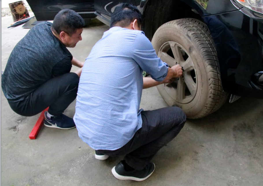 當(dāng)天上午9點,扶貧小組從川投大廈出發(fā),經(jīng)過近5個小時的車程后,在距離大坪村約7公里的村道上,車的左前輪被一顆螺絲釘扎破??紤]到時間緊迫,任務(wù)繁重,關(guān)志強總經(jīng)理當(dāng)機立斷決定自行換車胎,他率先垂范,不怕臟不怕累,親自拆裝輪胎。在大家的共同配合下,不到20分鐘的時間就完成了輪胎的拆卸、安裝和充氣,隨后再次踏上前往大坪村的路途。