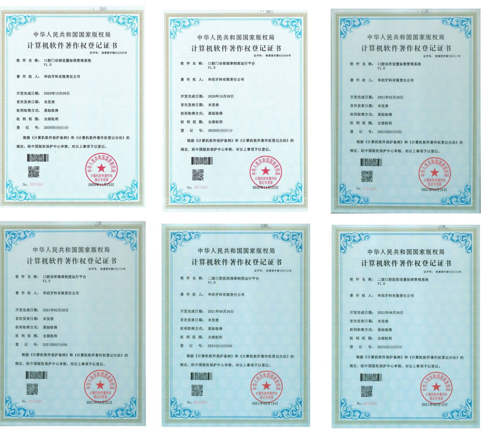 華西牙科知識產(chǎn)權(quán)建設(shè)項(xiàng)目工作組(以下簡稱“工作組”)一年多以來,以華西牙科醫(yī)療連鎖機(jī)構(gòu)標(biāo)準(zhǔn)化文件為基礎(chǔ)框架,多部門協(xié)作,陸續(xù)成立信息化子項(xiàng)目組,通過軟件開發(fā)的思路對醫(yī)療標(biāo)準(zhǔn)化文件進(jìn)行分類整理后研發(fā)完成了華西牙科體系下部分醫(yī)療信息化軟件的基礎(chǔ)版本。截至2021年11月,公司共完成并成功申請計(jì)算機(jī)軟件著作權(quán)6項(xiàng),分別是: