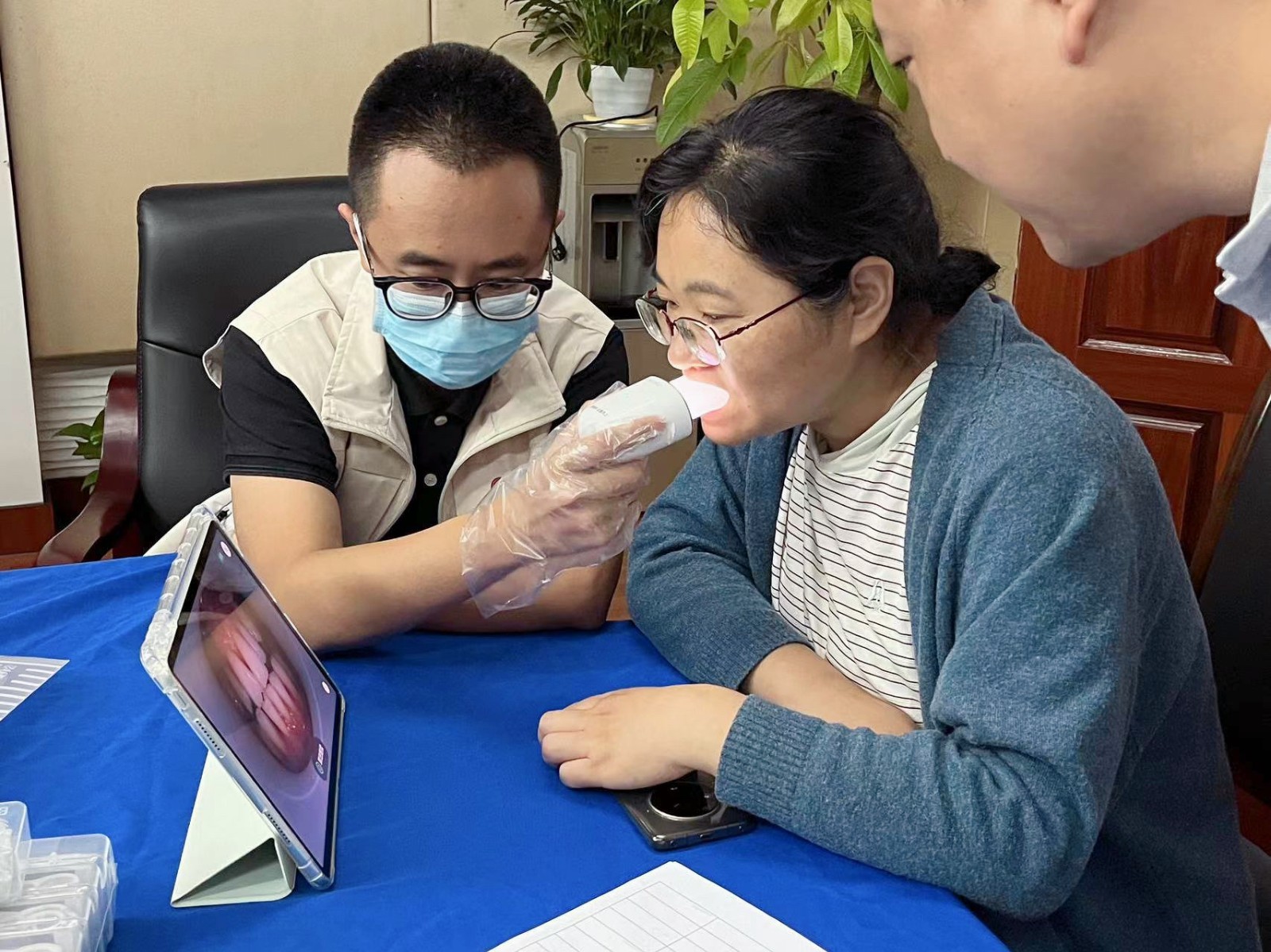 為更好地服務(wù)現(xiàn)場每一位職工,四川口腔醫(yī)院醫(yī)生團隊進行了一對一的口腔檢查與咨詢,在AI口腔掃描設(shè)備的輔助下,醫(yī)生能夠更加精準評估每位職工的口腔狀況,并提出針對性的建議和治療方案。