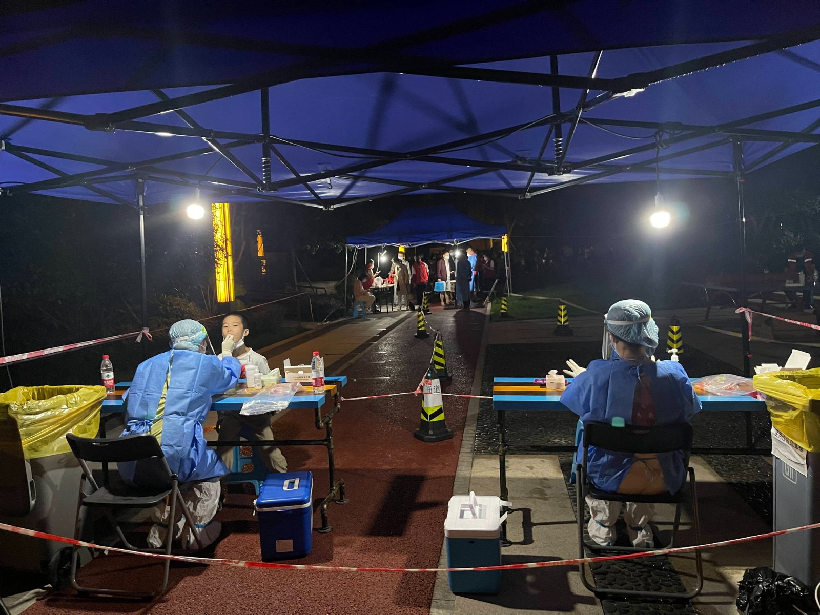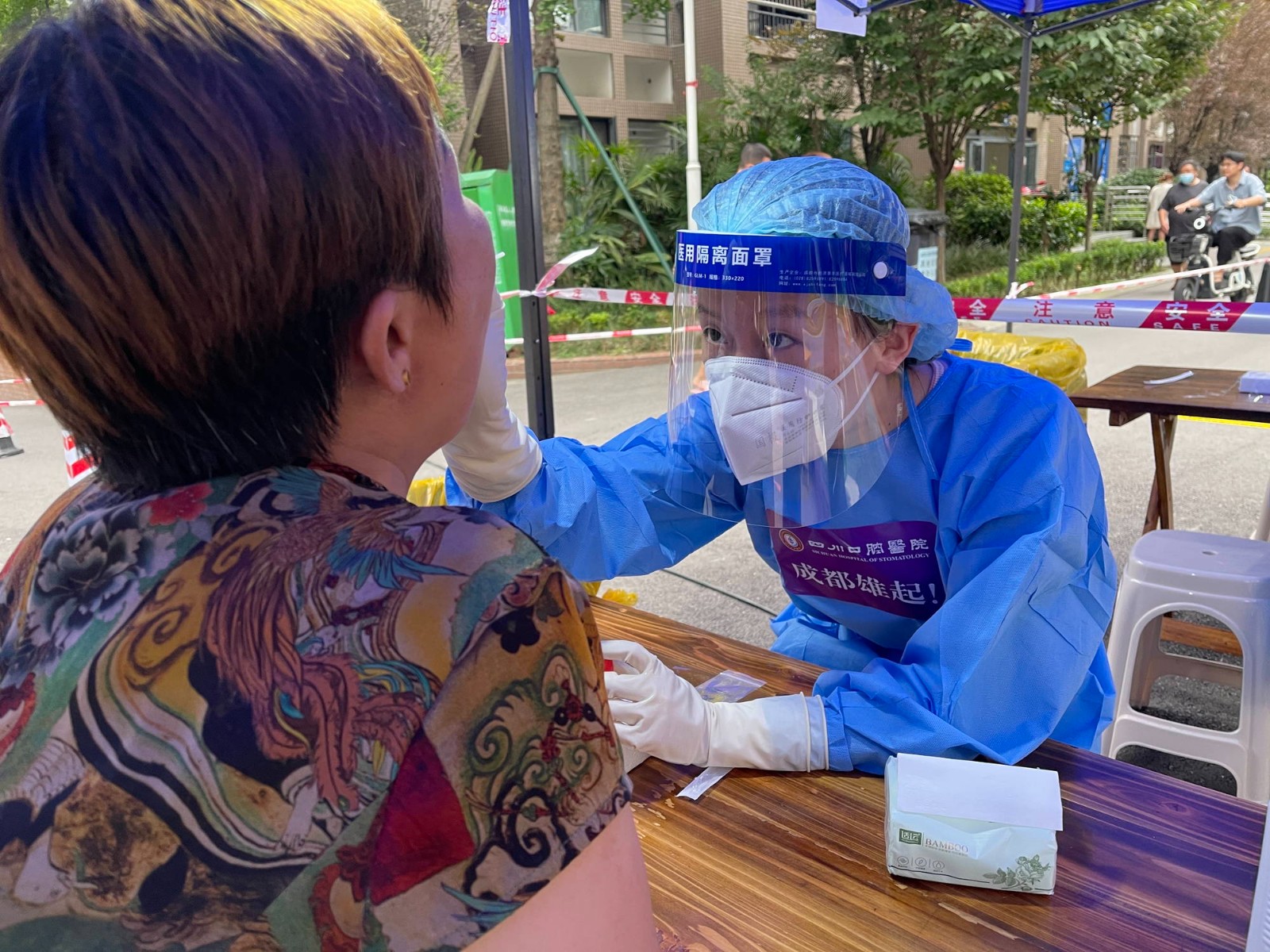 2日晚間,秋雨突襲,氣溫驟降,核酸采樣系統(tǒng)崩潰給正在緊鑼密鼓進行的核酸采樣工作帶來了前所未有的挑戰(zhàn)。面對焦急的居民,醫(yī)護人員和社區(qū)工作人員耐心地一遍遍向各位居民解釋,安撫大家的情緒。一遍不行,就再點第二遍、第三遍,有的醫(yī)務(wù)人員直接站在凳子上向天空尋找著信號......當前全市集中開展全員核酸檢測,給檢測平臺帶來了巨大的數(shù)據(jù)處理壓力,只有理解與攜手,所有人才能團結(jié)一致共克難關(guān)。全體華西牙科人深諳這一點,我們知道,只有堅守、只有團結(jié)才能取得勝利。盡管防護面罩被雨打濕,視線變得模糊,堅守工作崗位數(shù)個小時后雙手被汗水捂得發(fā)皺發(fā)白,醫(yī)護人員們?nèi)院翢o怨言,在盡力保障采樣效率的同時給予居民安慰,在雨中,用責任心和愛心為居民撐起一把“防護傘”。截至3日凌晨12:30,四川口腔醫(yī)院派出的醫(yī)務(wù)人員共計完成6000人次核酸采樣任務(wù)。