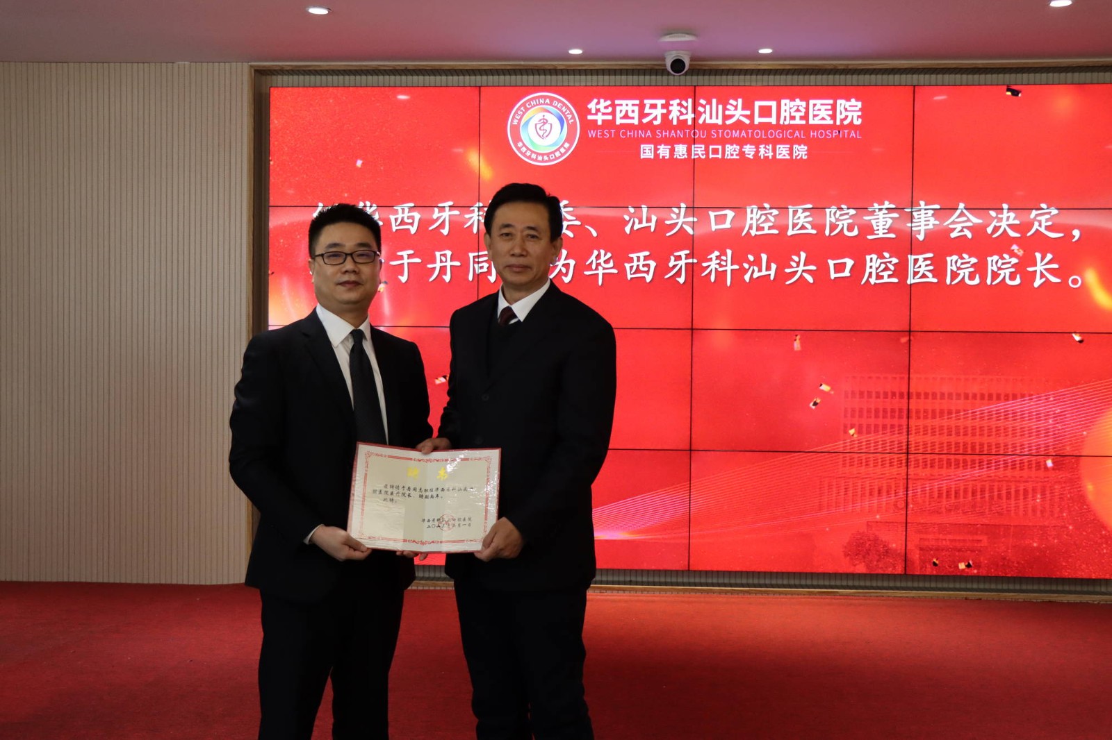 會(huì)上,鐘至誠(chéng)代表汕頭口腔醫(yī)院,聘任汕頭市醫(yī)學(xué)會(huì)主任委員、原汕頭大學(xué)醫(yī)學(xué)院第一附屬醫(yī)院口腔醫(yī)療中心主任于丹教授為汕頭口腔醫(yī)院院長(zhǎng),并頒發(fā)聘書。鐘至誠(chéng)指出,汕頭口腔醫(yī)院全體員工要在于丹教授的帶領(lǐng)下,齊心協(xié)力,團(tuán)結(jié)奮進(jìn),不斷提升醫(yī)療質(zhì)量和醫(yī)療水平,更好地服務(wù)廣大群眾。于丹教授作表態(tài)發(fā)言,他表示將會(huì)充分發(fā)揮自身優(yōu)勢(shì),不斷推進(jìn)醫(yī)療團(tuán)隊(duì)建設(shè)、人才培養(yǎng)和醫(yī)療質(zhì)量管控等工作。