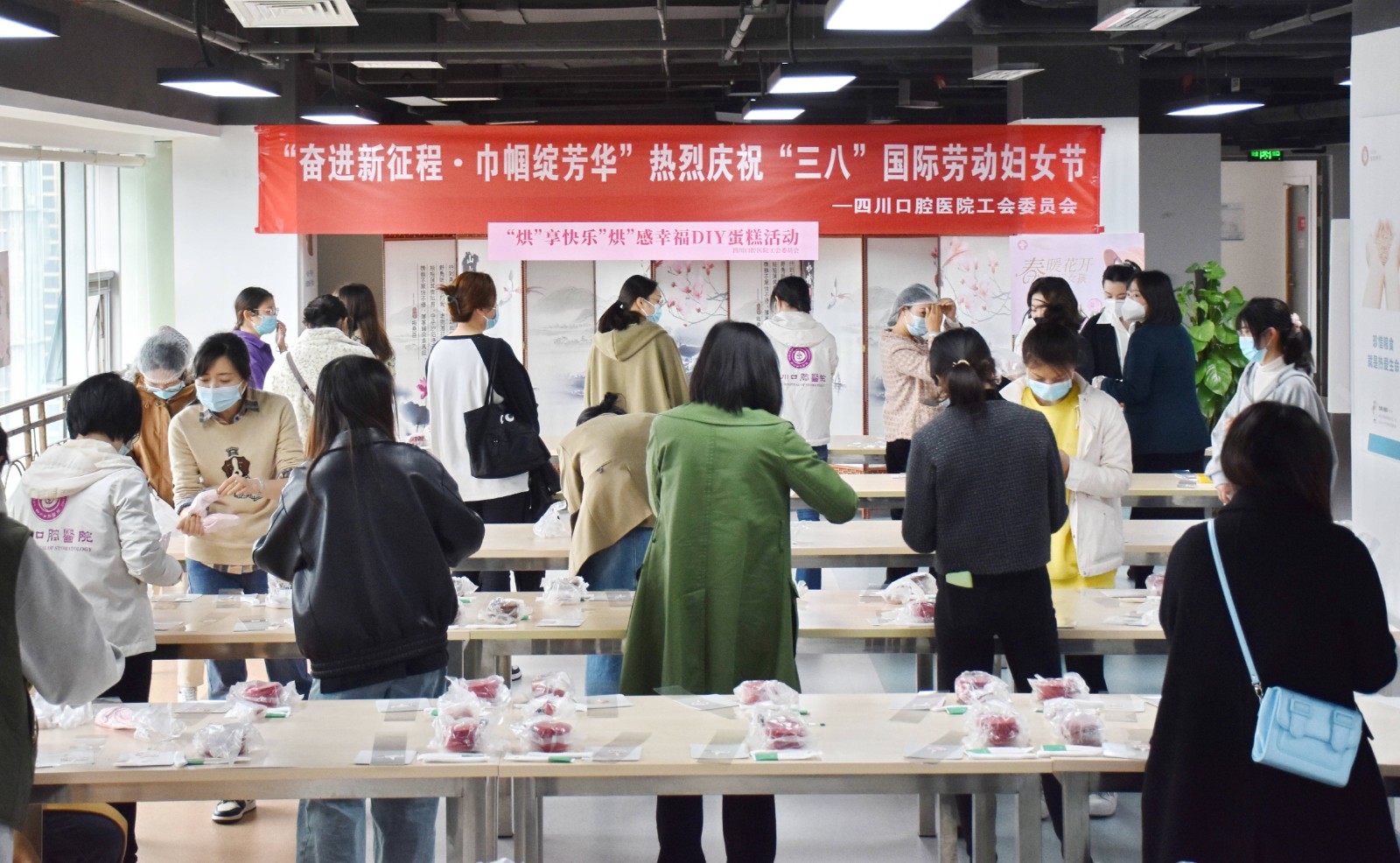 人間最美三月天,春花爛漫展新顏。在第113個(gè)“三八”國(guó)際勞動(dòng)?jì)D女節(jié)來臨之際,為豐富醫(yī)院女職工的精神文化生活,增強(qiáng)女職工的團(tuán)結(jié)凝聚力。3月7日下午,四川口腔醫(yī)院工會(huì)在16樓職工活動(dòng)室組織開展了以“奮進(jìn)新征程·巾幗綻芳華”為主題的“烘”享快樂,“焙”感幸福DIY蛋糕活動(dòng),共120余名女職工參加。