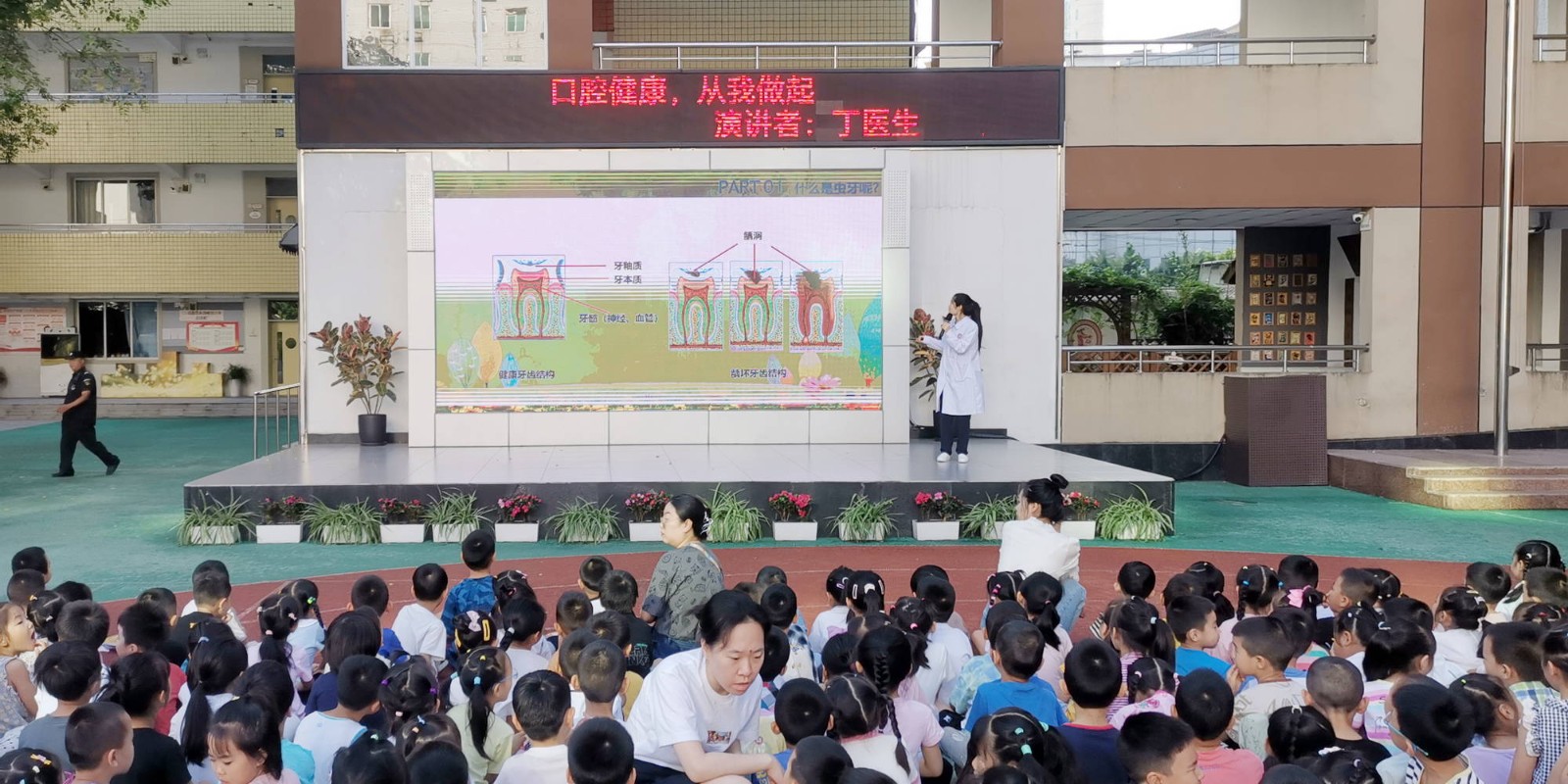 活動現場,四川口腔醫(yī)院醫(yī)生通過講座、播放科普視頻、發(fā)放科普資料等多種途徑與載體,以線上線下相結合的方式,提高學生、家長、教師對于口腔健康的關注度。