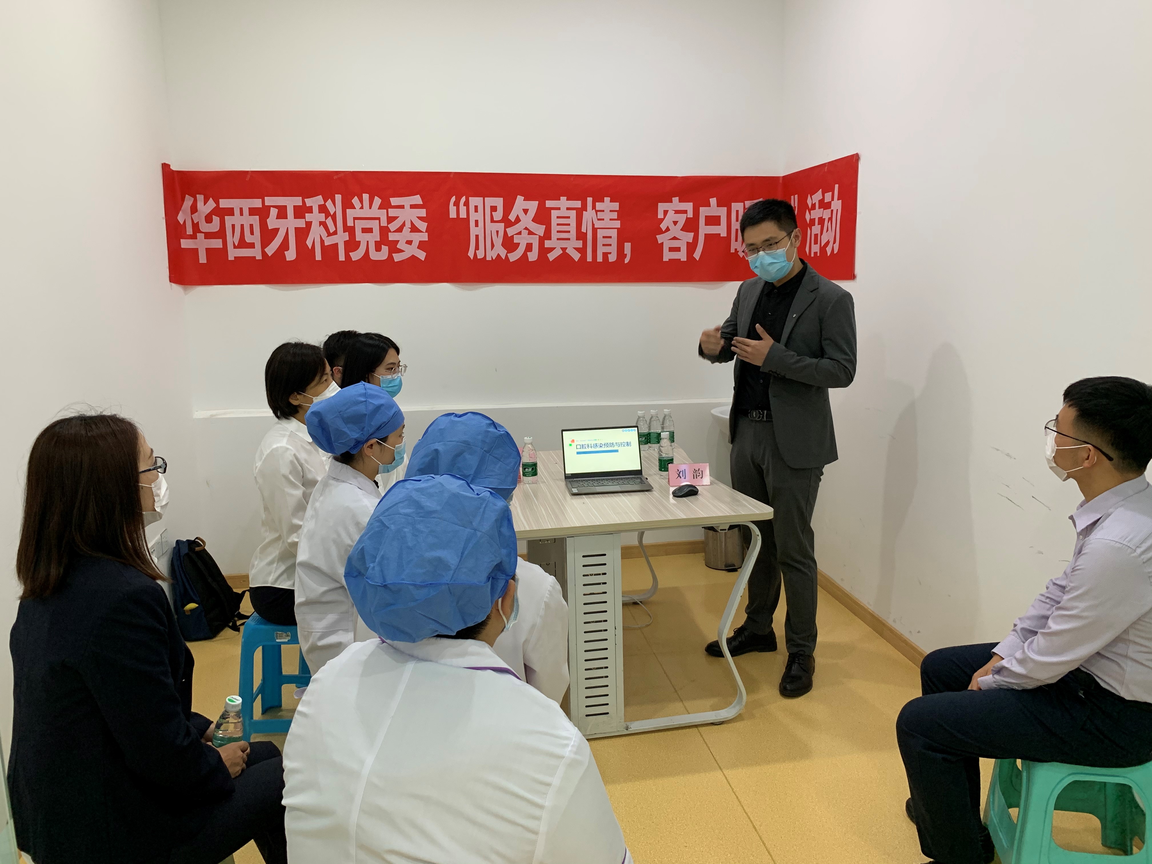 “國(guó)際護(hù)士節(jié)”來臨,5月12日上午,華西牙科組織開展“服務(wù)真情,客戶暖心”系列活動(dòng),業(yè)務(wù)團(tuán)隊(duì)在華西牙科所屬企業(yè)華西天健合作的成都市郫都區(qū)普樂米診所,會(huì)同運(yùn)營(yíng)人員及醫(yī)護(hù)人員現(xiàn)場(chǎng)講授感控知識(shí),培訓(xùn)口內(nèi)掃描儀等設(shè)備的實(shí)際操作,講解疫情下獲客注意事項(xiàng)。華西牙科黨委委員劉佳、華西天健教育培訓(xùn)副總監(jiān)劉韻、華西牙科黨員代表、醫(yī)生、護(hù)士代表參加了此次活動(dòng)。本次活動(dòng)是華西牙科臨時(shí)黨委開展貫徹《條例》試點(diǎn)工作系列活動(dòng)之一,活動(dòng)旨在發(fā)揮華西牙科品牌的服務(wù)優(yōu)勢(shì),促進(jìn)業(yè)務(wù)與黨建的深度融合。