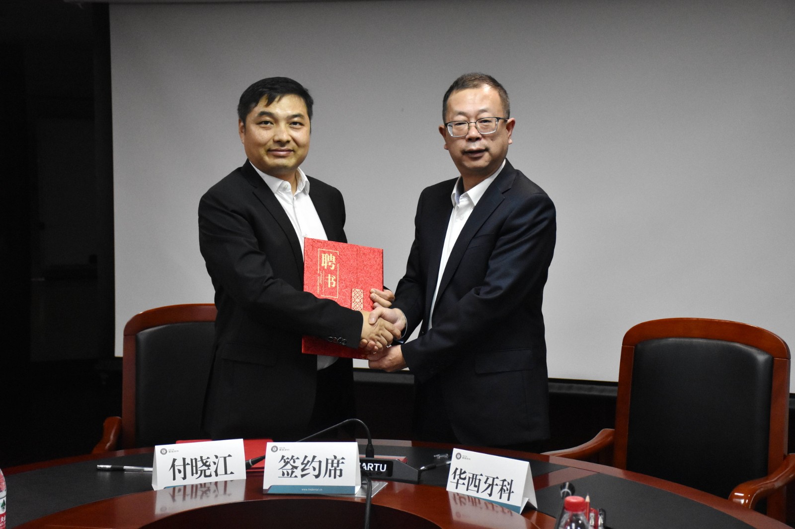 金晶介紹了付曉江先生基本情況。華西牙科代表、四川口腔醫(yī)院代表分別與付曉江先生簽訂聘任協(xié)議。劉凌云為付曉江先生頒發(fā)聘書。