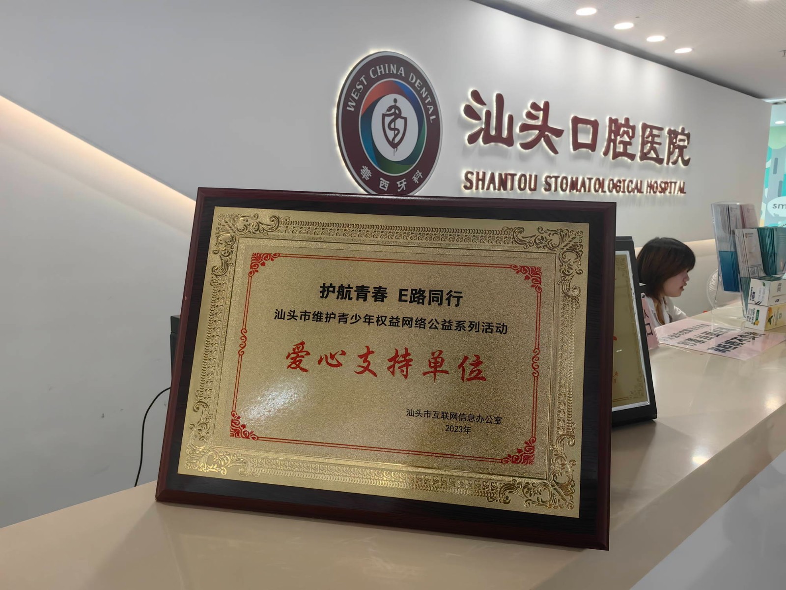活動(dòng)結(jié)束后,汕頭市互聯(lián)網(wǎng)信息辦公室向汕頭口腔醫(yī)院頒發(fā)了“護(hù)航青春 E路同行——汕頭市維護(hù)青少年權(quán)益網(wǎng)絡(luò)公益系列活動(dòng)”愛心支持單位獎(jiǎng)牌,旨在培樹榜樣、弘揚(yáng)公益精神,向全社會(huì)傳遞崇德向善的正能量,進(jìn)一步倡導(dǎo)奉獻(xiàn)愛心的文明風(fēng)尚。