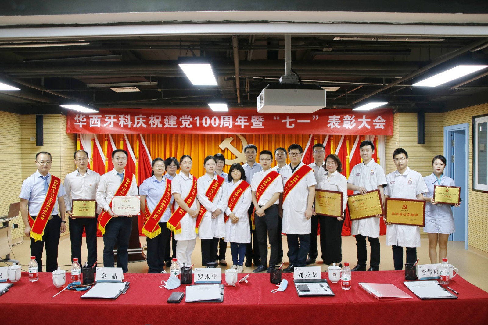 大會(huì)在《歌唱祖國(guó)》合唱中拉開(kāi)序幕。王海帆宣讀了《關(guān)于表彰2021年度“最美白衣天使”的通報(bào)》《關(guān)于2021年度“黨員示范崗”、“黨員先鋒崗”評(píng)選結(jié)果的通報(bào)》《關(guān)于表彰2021年度優(yōu)秀共產(chǎn)黨員、優(yōu)秀黨務(wù)工作者和先進(jìn)基層黨組織的通報(bào)》。公司班子成員對(duì)2021年度 “最美白衣天使”、“優(yōu)秀共產(chǎn)黨員”、“優(yōu)秀黨務(wù)工作者”、先進(jìn)基層黨組織進(jìn)行了頒獎(jiǎng),并對(duì) 獲得“黨員示范崗”、 “黨員先鋒崗”的同志進(jìn)行了授牌,以此鼓勵(lì)受表彰的個(gè)人再接再厲、再創(chuàng)佳績(jī),同時(shí)號(hào)召華西牙科全體黨員員工以他們?yōu)榘駱?,立足本職、?wù)實(shí)重干、奮勇?tīng)?zhēng)先,為華西牙科的發(fā)展做出新的更大的貢獻(xiàn)。